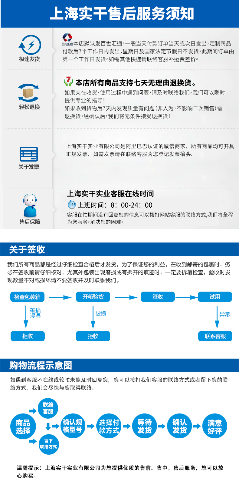 13、本產品自銷售之日起一個月內,在正常使用及外觀無破損情況下出現產品質量問題,客戶憑銷售票據原件、有效保修卡及完整包裝到原購買處或本公司更換相同的規格型號的產品,更換以后的產品延續原產品的保修期限和條款。